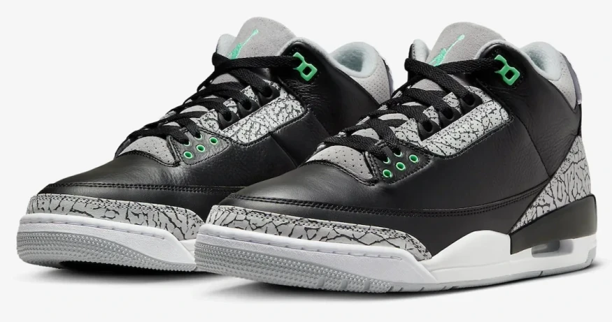 These shoes have a grey rubber sole and a clean white midsole. The uppers are made of black leather, with grey elephant print details. Further, there are vibrant green accents on the lace locks and the Jordan branding on the tongue. You'll also find a green Jumpman on the heel. Overall, these shoes have a simple color style, with lively green accents adding some excitement. Keep an eye out for these shoes to be released in the first half of 2024 as sneakerheads get ready for this Air Jordan 3 drop.