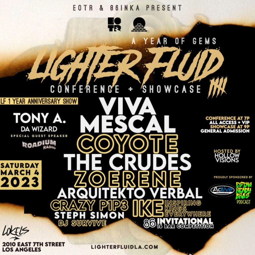 Catch Viva Mescal headlining with Coyote & More at Lighter Fluid 5 Hip Hop event! Also performing The Crudes, Zoerene, Arquitekto, Verbal, Crazy Pip3, Steph Simon, IKE, DJ Survive and 86 INVITATIONAL 16BAR COMPETITION!!! Tickets EVENTBRITE.COM & website lighterfluidla.com.