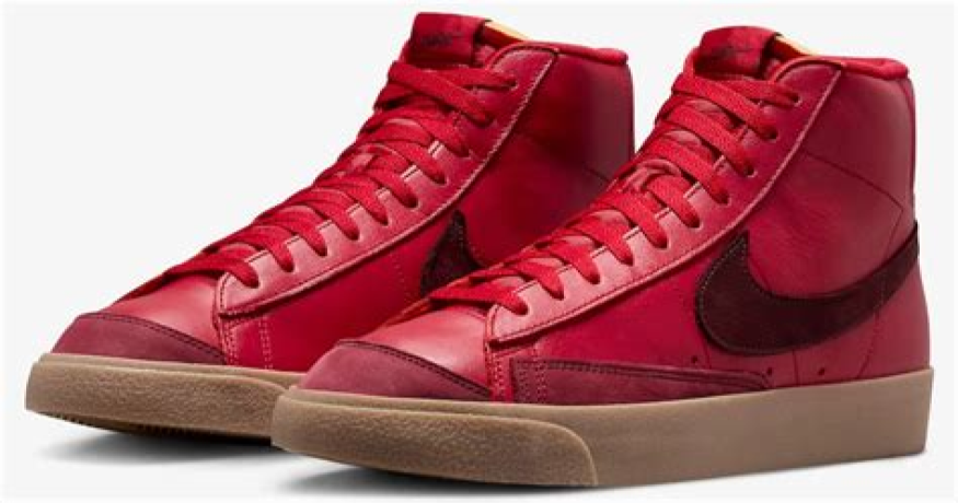 The sneakers feature a dark gum rubber sole that extends into the midsole. Deep red leather constructs the uppers, with additional red leather overlays. Deeper red suede is visible near the toebox and heels. The sides feature a Nike Swoosh made of burgundy leather. Finally, red laces and Nike branding on the tongue and heels complete this sneaker.